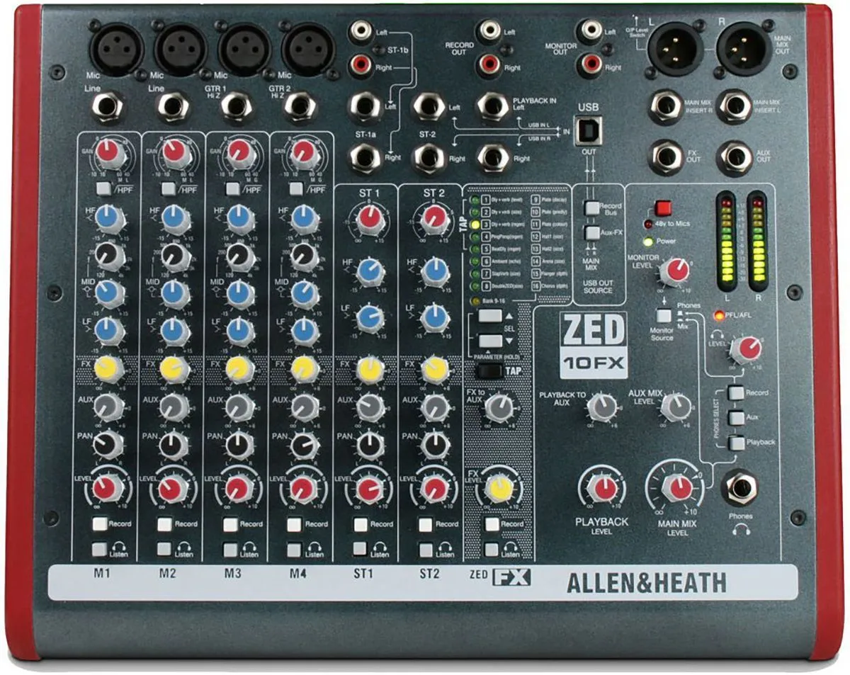 ZED10 - компактный микшер со встроенным USB-интерфейсом. Ультра портативная конструкция позволяет использовать его для записи в реальном времени или в студии. Настраиваемый USB вход/выход облегчает процесс записи. Гитары можно подключить непосредственно к микшеру, используя специально разработанные входы высокого импеданса, также микшер имеет два стерео входа для MP3 / CD плееров или клавиш и оборудован профессиональными XLR стерео выходами и гибкой секции мониторинга с наушников.
